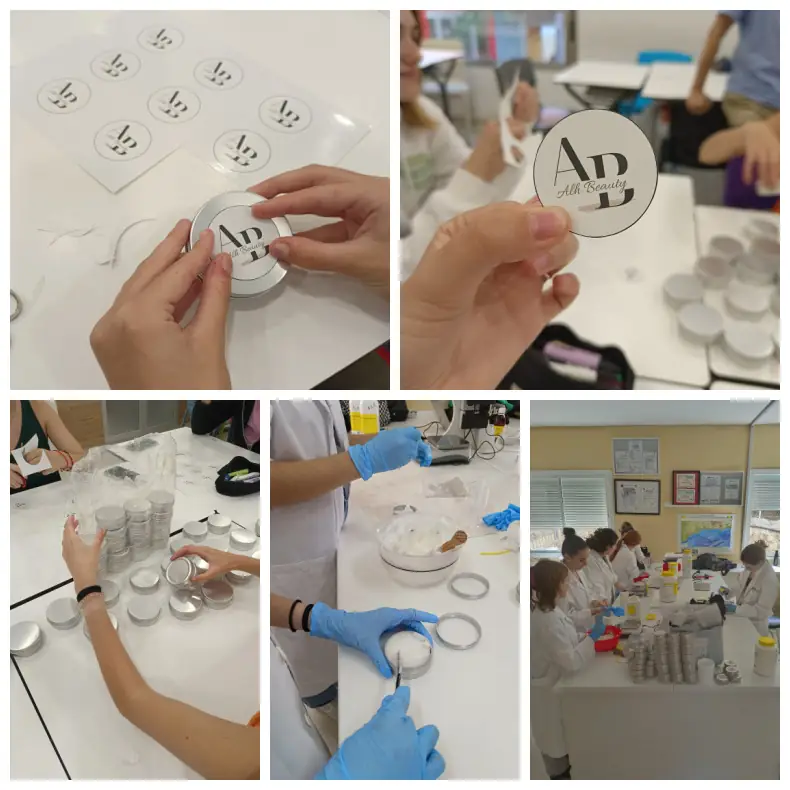 Estas jóvenes estudiantes del Grado Medio en Técnico en Farmacia y Parafarmacia están trabajando en la gestión de la firma ‘Alhbeauty’, nombre real de la sociedad mercantil dedicada a la fabricación y comercialización de productos de estética. Creada bajo la supervisión de la titular de la asignatura de ‘Empresa’ Vicen Ruiz; en colaboración con las también profesoras de FP del centro Gema Gago, licenciada en Farmacia y docente de ‘Formulación Magistral’ en este módulo, junto a la también profesora Eva López y Jesús Marfil, quien dirige la asignatura de ‘Oficina de Farmacia’.