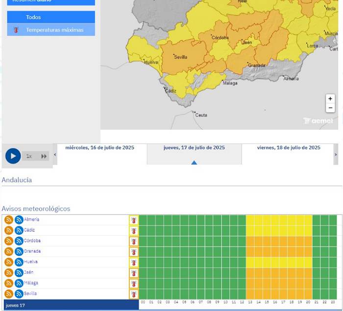 Según informa la Agencia Estatal de Meteorología (AEMET), varias provincias andaluzas estarán este miércoles en aviso amarillo y naranja por altas temperaturas, con especial incidencia en las campiñas de Sevilla, Córdoba y Jaén, así como en zonas del Valle del Guadalquivir, donde se prevén máximas que podrían superar los 42 grados.