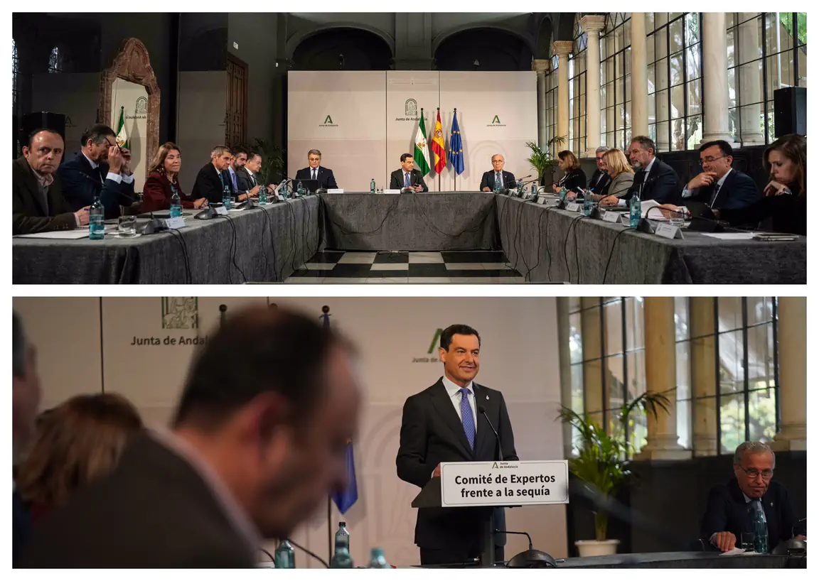 Juanma Moreno hace un llamamiento a los ciudadanos para tratar el agua como un bien escaso y extremar la prudencia en su uso. Destaca que medio millón de andaluces ya tienen restricciones y otros siete millones y medio sufren de alguna forma los condicionantes de la sequía. En esta emergencia, solicita ayuda y cooperación al Gobierno central y otras administraciones, instando a que se centren en buscar soluciones al déficit hídrico que sufre la región. En la reunión del Comité de Expertos frente a la sequía, también estuvieron presentes el consejero de la Presidencia, Interior, Diálogo Social y Simplificación Administrativa, Antonio Sanz; la consejera de Agricultura, Pesca, Agua y Desarrollo Rural, Carmen Crespo; y el consejero de Sostenibilidad, Medio Ambiente y Economía Azul, Ramón Fernández-Pacheco.