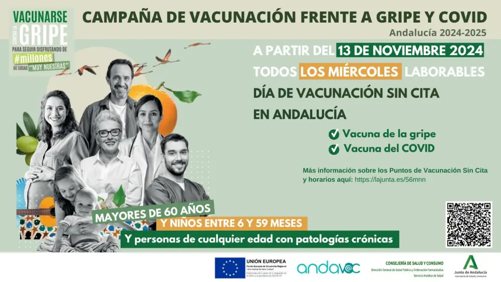 A partir del miércoles 13 de noviembre, la Consejería de Salud y Consumo de Andalucía, a través de la Dirección General de Salud Pública y Ordenación Farmacéutica y el Servicio Andaluz de Salud, comenzará la vacunación sin cita previa para la población diana en 623 puntos distribuidos por toda la comunidad. Entre estos, 212 puntos contarán con horario de tarde, facilitando así el acceso a las personas incluidas en la campaña de vacunación 2024-2025.