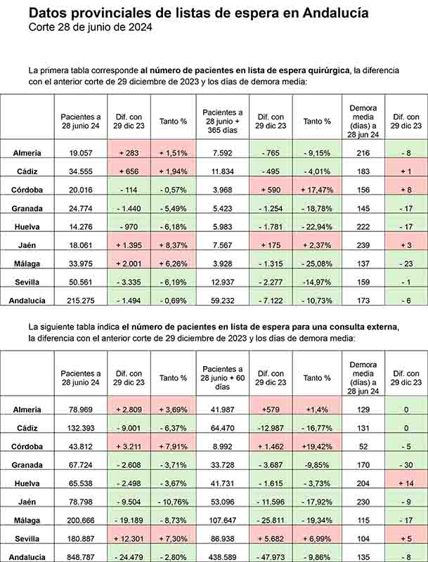 La Consejería de Salud y Consumo de la Junta de Andalucía ha informado al Consejo de Gobierno sobre los nuevos datos relativos a las listas de espera quirúrgica y de consultas externas, publicadas en la web del Servicio Andaluz de Salud (SAS) en el día de hoy. Estos datos, con corte de 28 de junio, reflejan una mejoría respecto a los últimos datos publicados con fecha 29 de diciembre de 2023.