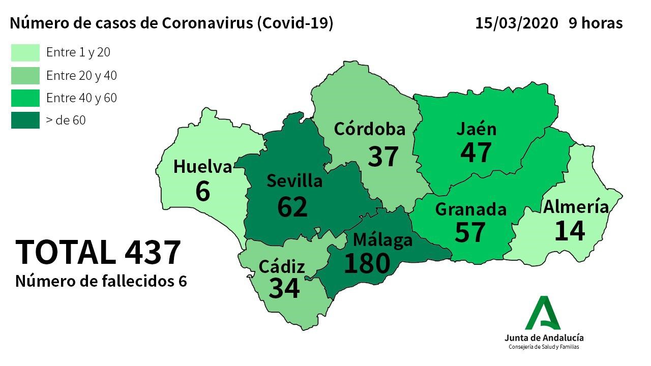 La Consejería de Salud y Familias informa que se han confirmado en Andalucía 61 nuevos casos de Coronavirus en las últimas horas. Así, el número total de afectados en Andalucía asciende a 437.