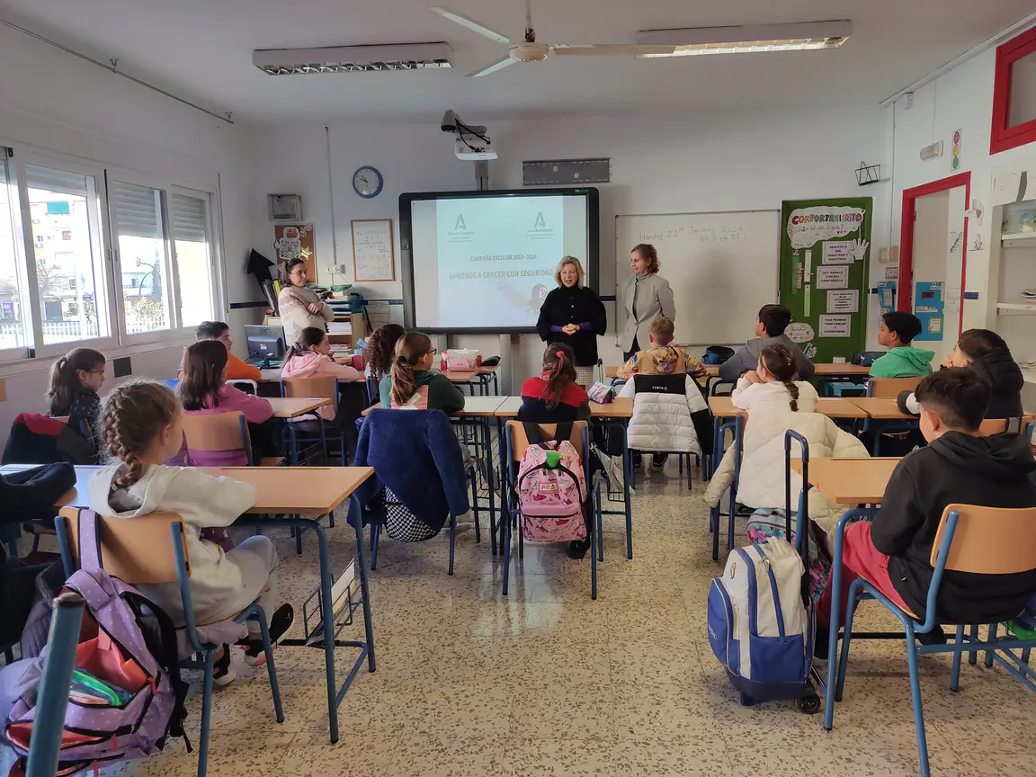 La delegada de Empleo, Empresa y Trabajo Autónomo de la Junta de Andalucía en Málaga, Carmen Sánchez Sierra, junto a la secretaria general provincial de Desarrollo Educativo y Formación Profesional, Paloma Rodríguez Bonilla, ha inaugurado esta mañana la XXII edición del programa escolar “Aprende a Crecer con Seguridad” en el CEIP Camino de San Rafael, donde 35 estudiantes de quinto de primaria han recibido charlas sobre la prevención de riesgos.