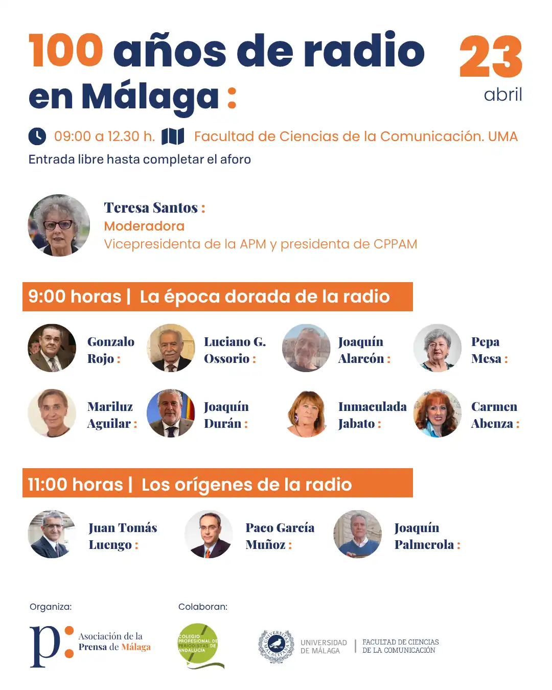 El programa se estructura en dos mesas redondas. La primera, centrada en la época dorada de la radio, se celebrará entre las 9.00 y las 11.00 horas y contará con la participación de profesionales que protagonizaron aquellos años, como Gonzalo Rojo, Luciano González, Joaquín Alarcón, Pepa Mesa, Mariluz Aguilar Galindo, Joaquín Durán, Inmaculada Jabato y Carmen Abenza. A través de sus testimonios, se abordará la forma de hacer radio en un contexto previo a la irrupción de la televisión, así como la capacidad del medio para adaptarse y mantenerse vigente.