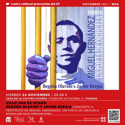 El Ciclo Son de Otoño del Centro de la Generación del 27 de la Diputación de Málaga une a Begoña Olavide y a Javier Bergia para interpretar distintos poemas de Miguel Hernández a través de la música y para rendir homenaje a uno de los miembros más jóvenes de la Generación del 27.