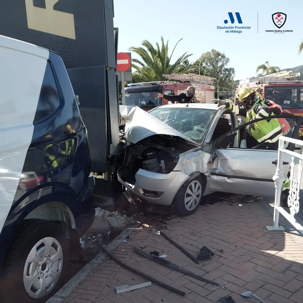 El siniestro se produjo cuando un vehículo colisionó contra el tótem informativo del establecimiento. Como consecuencia del impacto, el conductor quedó atrapado en el interior del automóvil, lo que requirió la actuación inmediata de los servicios de emergencia.