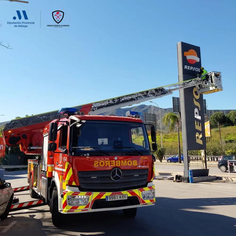Además de la asistencia al accidentado, los efectivos del CPB llevaron a cabo labores de saneamiento en la estructura del tótem de la gasolinera, con el objetivo de eliminar elementos que presentaban riesgo de desprendimiento y garantizar la seguridad en la zona.