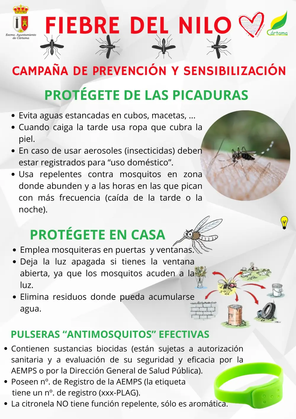 El Ayuntamiento de Cártama y el Consorcio Sanitario del Valle del Guadalhorce recomiendan a la población tomar precauciones, especialmente en los meses de primavera y verano, cuando los mosquitos tienen mayor actividad: