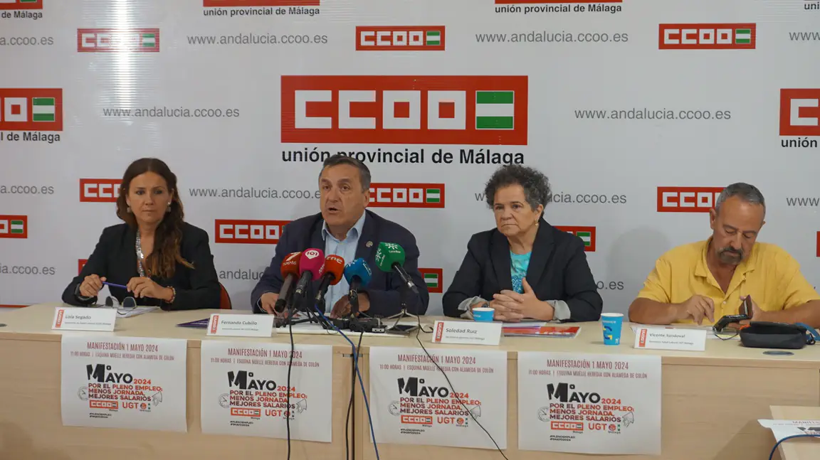 Las dos organizaciones sindicales mayoritarias en Málaga han realizado un llamamiento a la ciudadanía de esta provincia para que participe “masivamente” en la manifestación que tendrá lugar el próximo miércoles, 1 de mayo, Día Internacional del Trabajo, con salida a las 11:00 horas desde la esquina de Muelle Heredia con Alameda de Colón. En la rueda de prensa han estado presentes el secretario general de CCOO de Málaga, Fernando Cubillo, y su homóloga en UGT, Soledad Ruiz. También han estado acompañados por los responsables del área de Salud Laboral, Lola Segado, por CCOO, y Vicente Sandoval, por UGT, con motivo de la celebración del 28 de abril, Día Mundial por el Trabajo Decente.