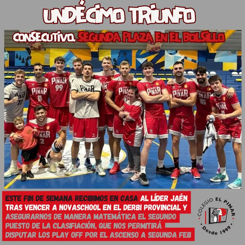 Jugar, ganar y soñar. Por este orden. Es lo que han hecho este fin de semana, en la Vigésimo Primera jornada de Liga de la Cuarta División del basket nacional los jugadores del primer equipo del CD Colegio El Pinar. Un derbi ante Novaschool en el que estaba en juego algo más que la undécima victoria consecutiva del ‘rodillo’ colegial, lograda en virtud del 70-73 final. Lo que se decidía en la cancha de Añoreta era nada menos que la clasificación matemática para los ‘play off’ por el ascenso a Segundo FEB -antigua LEB Plata- y eso es exactamente lo que han logrado los hombres de Javier Florido en un choque que, como se preveía, fue el más disputado de las últimas campañas. Nervios, tensión y una sensación de que la balanza podía decantarse hacía cualquier contendiente en cualquier instante, pero que los deportistas rojillos finalmente inclinaron a su favor. En virtud de este éxito, este lunes de resaca liguera se disfruta ya con el pie dentro de la pugna por el ascenso, pero también con la mirada puesta en la visita del todopoderoso Jaén FS, líder indiscutible del grupo, hueso donde los haya y, sin duda, el único rival que le queda al CD Colegio El Pinar.
