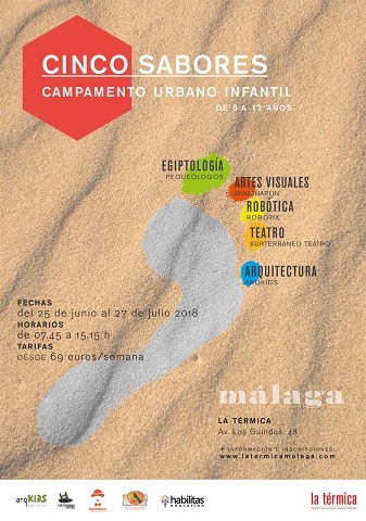 Por tercer año consecutivo La Térmica propone un campamento infantil muy especial para la llegada del verano. Se trata de ‘Cinco sabores’, una propuesta que reúne talleres diferentes de arquitectura, artes visuales, egiptología, robótica y teatro. Está dirigido a niños y niñas de 5 a 12 años, que podrán asistir al campamento entre una y cinco semanas, del 25 de junio al 27 de julio, con un contenido cultural y divertido.