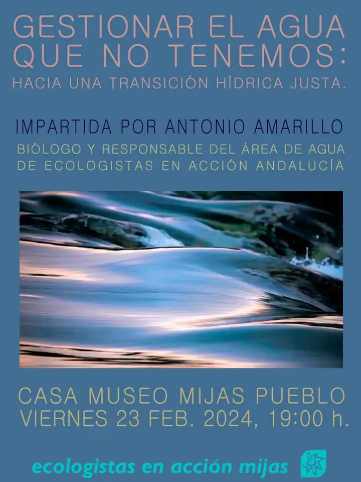 Ecologistas en Acción Mijas ha organizado una conferencia titulada «Gestionar el agua que no tenemos: hacia una transición hídrica justa». La charla se llevará a cabo el viernes 23 de febrero de 2024, a las 19:00 horas, en la Casa Museo local.