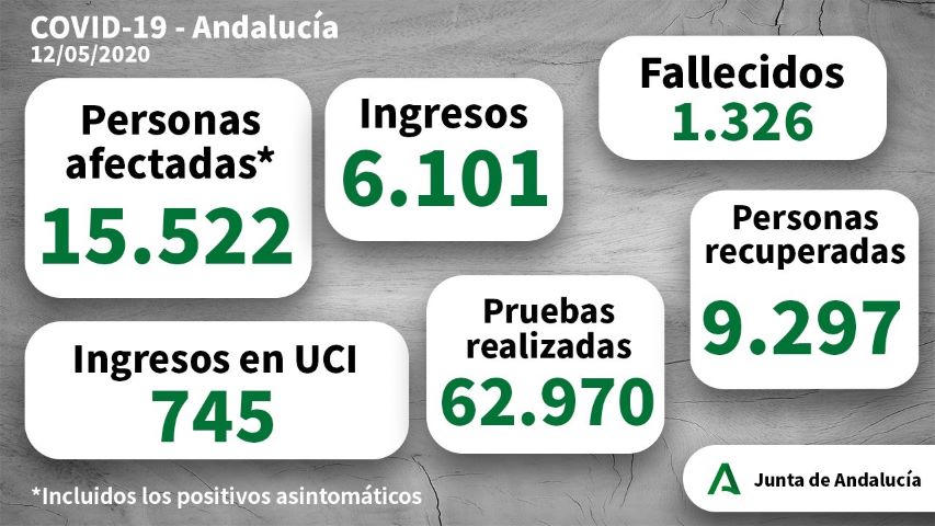 Por provincias: en Almería (22 hospitalizaciones de los que 3 en UCI), Cádiz (57 hospitalizaciones de los que 13 en UCI), Córdoba (34 hospitalizaciones de los que 13 en UCI), Granada (87 hospitalizaciones de los que 18 en UCI), Huelva (5 hospitalizaciones de los que 4 en UCI), Jaén (53 hospitalizaciones de los que