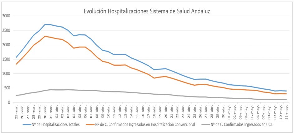 Actualmente, 395 pacientes confirmados con COVID-19 permanecen ingresados en los hospitales andaluces, de los que 99 se encuentran en UCI.