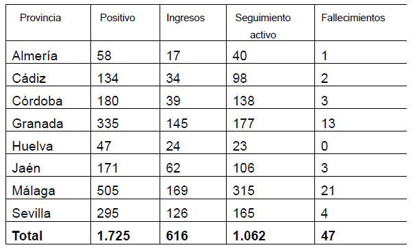 De los 1.725 casos positivos en Andalucía, 505 en Málaga y 21 fallecidos en la provincia.