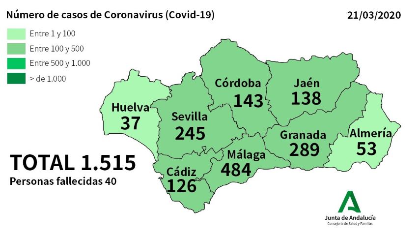 La Consejería de Salud y Familias informa que se han confirmado en Andalucía 228 nuevos casos de Coronavirus en las últimas horas. Así, el número total de afectados en Andalucía asciende a 1515.