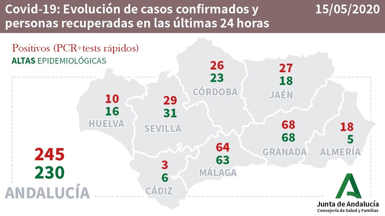 La Consejería Salud y Familias informa que se han confirmado en Andalucía 245 nuevos casos de Coronavirus en las últimas horas. Así, el número total de afectados en Andalucía asciende a 16.068.