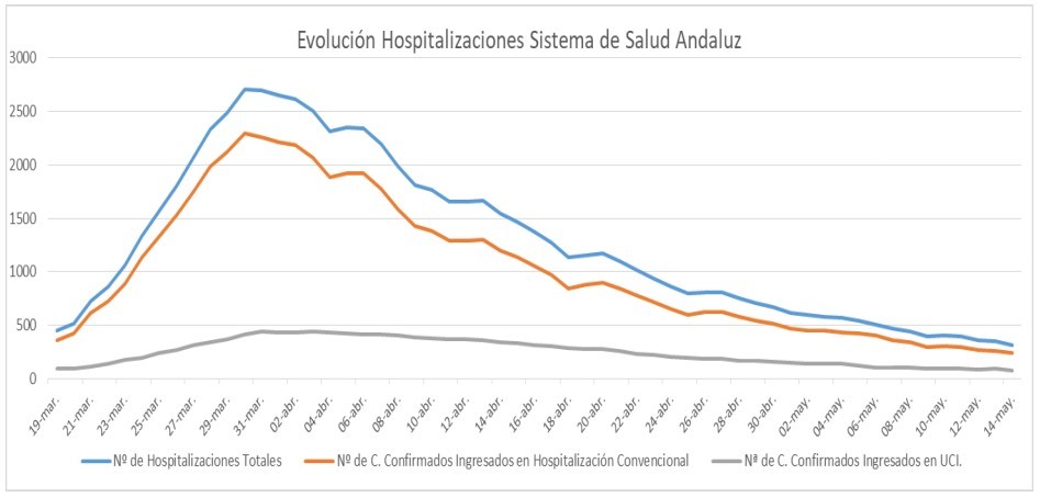 Por provincias: en Almería (19 hospitalizaciones de los que 2 en UCI), Cádiz  (37 hospitalizaciones de los que 9 en UCI), Córdoba (30 hospitalizaciones de los que 12 en UCI), Granada  (62 hospitalizaciones de los que 15 en UCI), Huelva  (4 hospitalizaciones de los que 3 en UCI), Jaén  (40 hospitalizaciones de los que 9 en UCI), Málaga   (60 hospitalizaciones de los que 10 en UCI) y Sevilla   (63 hospitalizaciones de los que 16 en UCI).