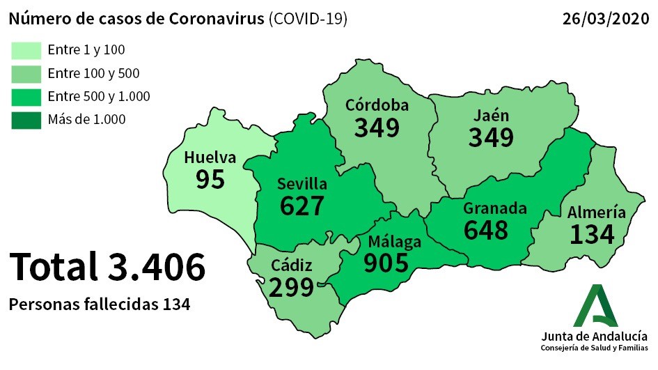 El número de fallecidos en Andalucía asciende a 134.