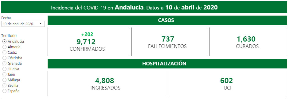 La Consejería Salud y Familias informa que se han confirmado en Andalucía 202 nuevos casos de Coronavirus en las últimas horas. Así, el número total de afectados en Andalucía asciende a 9.712.