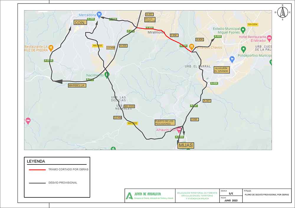 Con motivo de las obras de mejora de la seguridad vial que está realizando la Delegación Territorial de la Consejería de Fomento, Articulación del Territorio y Vivienda en la carretera A-404, de Coín a Churriana, se hará necesario el corte provisional en varios kilómetros de la vía a partir del próximo 2 de agosto.