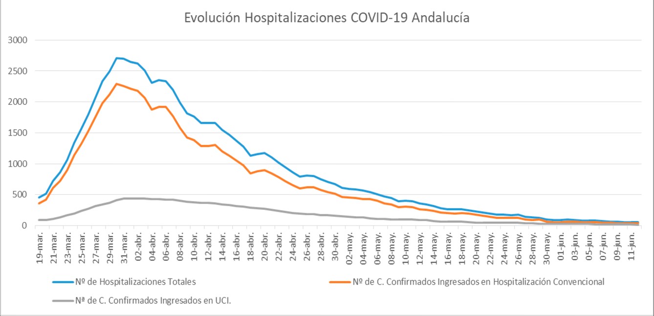 Por provincias: en Almería (6 hospitalizaciones y ninguno en UCI), Cádiz   (7 hospitalizaciones de los que 4 en UCI), Córdoba (4 hospitalizaciones de los que 1 en UCI), Granada   (10 hospitalizaciones de los que 4 en UCI), Huelva (1 hospitalizaciones de los que 1 en UCI), Jaén  (1 hospitalizaciones de los que 1 en UCI), Málaga (15 hospitalizaciones de los que 3 en UCI) y Sevilla (9 hospitalizaciones de los que 3 en UCI).