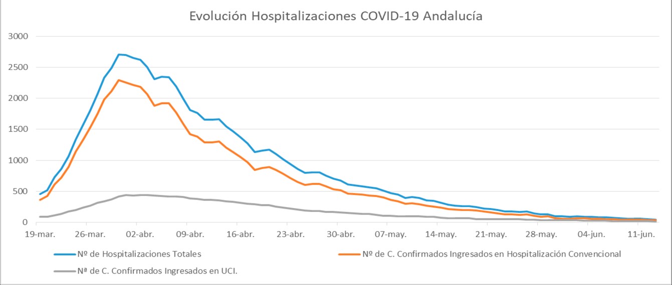 La Consejería de Salud y Familias informa de que, actualmente, 47 pacientes confirmados con COVID-19 permanecen ingresados en los hospitales andaluces, de los que 14 se encuentran en UCI.