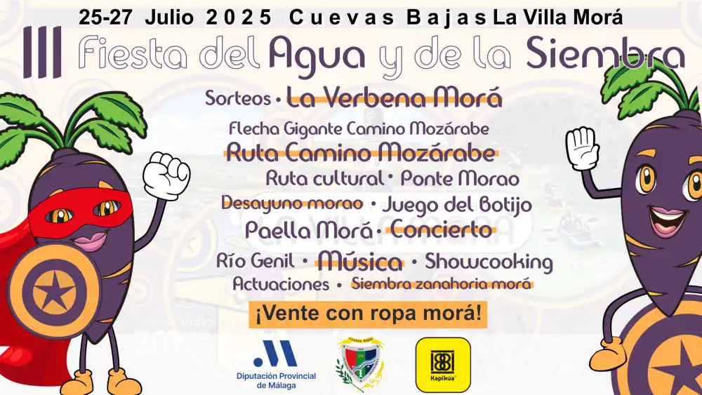 El municipio de Cuevas Bajas organiza este fin de semana la tercera edición de la Fiesta del Agua y la Siembra de la zanahoria morá. El programa de la festividad incluye una verbena, demostraciones de cocina, talleres, sorteos, rafting en el río Genil y rutas de senderismo, entre otras actividades.