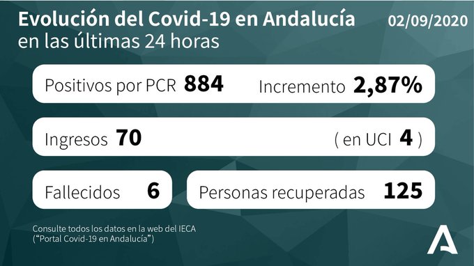 Por provincias: en Almería (114 hospitalizaciones, de los que 21 en UCI), Cádiz (72 hospitalizaciones, de los que 13 en UCI), Córdoba (56 hospitalizaciones, de los que 3 en UCI), Granada (55 hospitalizaciones, de los que 2 en UCI), Huelva (4 hospitalizaciones y ninguno en UCI), Jaén (21 hospitalizaciones, de los que 4 en UCI), Málaga (147 hospitalizaciones, de los que 19 en UCI) y Sevilla (53 hospitalizaciones, de los que 8 en UCI).