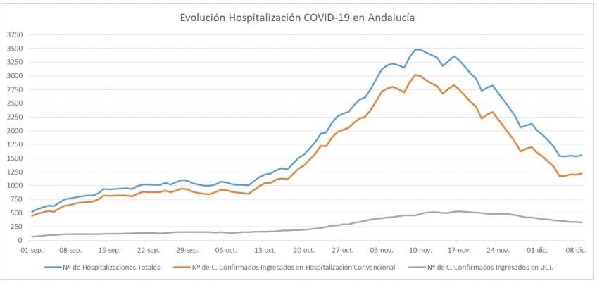 Por provincias: en Almería (118 hospitalizaciones, de las que 38 en UCI), Cádiz (253 hospitalizaciones, de las que 46 en UCI), Córdoba (143 hospitalizaciones, de las que 29 en UCI), Granada (322 hospitalizaciones, de las que 85 en UCI), Huelva (106 hospitalizaciones, de las que 15 en UCI), Jaén (183 hospitalizaciones, de las que 31 en UCI), Málaga (220 hospitalizaciones, de las que 30 en UCI) y Sevilla (209 hospitalizaciones, de las que 57 en UCI).
