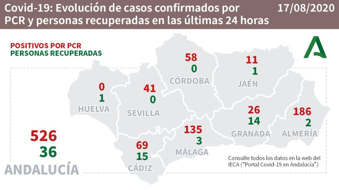 Por provincias: en Almería (56 hospitalizaciones, de los que 17 en UCI), Cádiz (19 hospitalizaciones, de los que 4 en UCI), Córdoba (13 hospitalizaciones, de los que 2 en UCI), Granada (22 hospitalizaciones, de los que 3 en UCI), Huelva (4 hospitalizaciones, de los que 1 en UCI), Jaén (9 hospitalizaciones y 1 en UCI), Málaga (42 hospitalizaciones, de los que 3 en UCI) y Sevilla (17 hospitalizaciones y 4 en UCI).