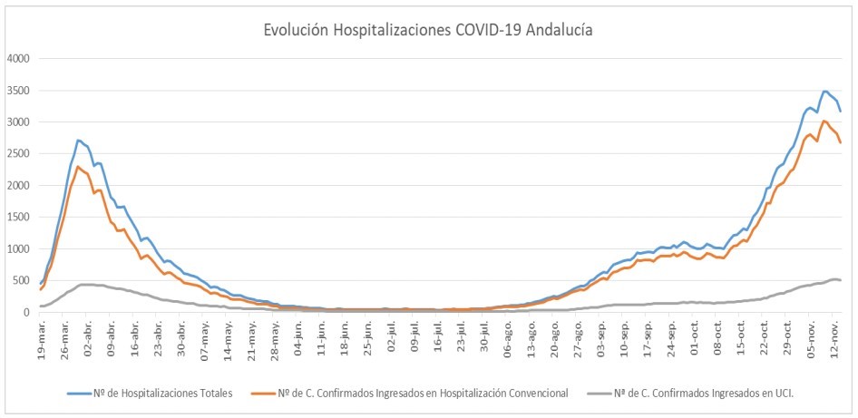 La Consejería de Salud y Familias informa de que, actualmente, 3.179 pacientes confirmados con COVID-19 permanecen ingresados en los hospitales andaluces, de los que 503 se encuentran en UCI.