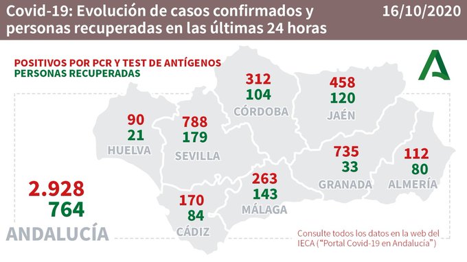 Por otro lado, por problemas técnicos, en el comunicado de ayer no pudimos reflejar los brotes que permanecen activos de la semana pasada en Andalucía (a 14 de octubre). En total son 169: 15 en Almería, 8 en Cádiz, 12 en Córdoba, 32 en Granada, 6 en Huelva, 28 en Jaén, 18 en Málaga y 50 en Sevilla.