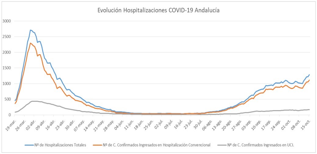 La Consejería de Salud y Familias informa de que, actualmente, 1.281 pacientes confirmados con COVID-19 permanecen ingresados en los hospitales andaluces, de los que 171 se encuentran en UCI.