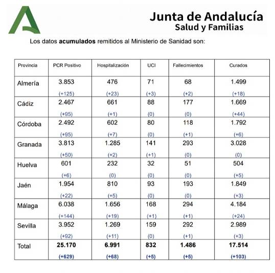 Por provincias: en Almería (80 hospitalizaciones, de los que 14 en UCI), Cádiz (40 hospitalizaciones, de los que 9 en UCI), Córdoba (27 hospitalizaciones y ninguno en UCI), Granada (33 hospitalizaciones, de los que 1 en UCI), Huelva (4 hospitalizaciones y ninguno en UCI), Jaén (12 hospitalizaciones, de los que 1 en UCI), Málaga (82 hospitalizaciones, de los que 6 en UCI) y Sevilla (30 hospitalizaciones y 5 en UCI). * Las pequeñas oscilaciones en el número absoluto de datos dependen de diferentes factores relacionados con la recogida de los mismos, que se realiza día a día, caso a caso, y a la mejora de la calidad de los mismos. * El dato de positivos PCR del día anterior se puede consultar en la web del IECA. * Estos datos corresponden a las 7:00 horas. Todos los datos están disponibles en la web del IECA en el siguiente enlace: http://www.juntadeandalucia.es/institutodeestadisticaycartografia/salud/ COVID19.html Brotes Con respecto al brote declarado en la residencia El Zapillo de Almería se contabilizan 93 casos positivos, tras confirmarse 5 casos nuevos en residentes y 6 en trabajadores. El número de fallecidos asociados a este brote es de 3 personas. En total se contabilizan 62 residentes confirmados y 31 trabajadores.