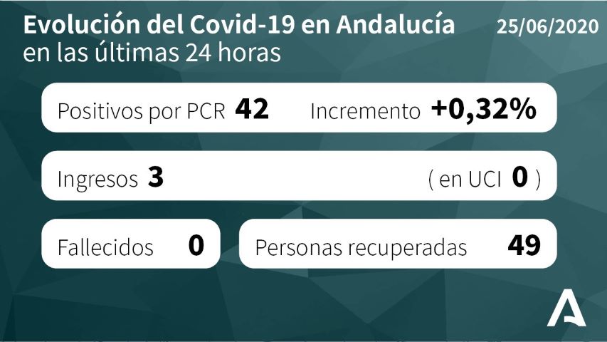 Por provincias: en Almería (2 hospitalizaciones y ninguno en UCI), Cádiz (7 hospitalizaciones de los que 1 en UCI), Córdoba (4 hospitalizaciones de los que 1 en UCI), Granada (9 hospitalizaciones de los que 4 en UCI), Huelva (2 hospitalizaciones de los que 1 en UCI), Jaén (1 hospitalizaciones de los que 1 en UCI), Málaga (10 hospitalizaciones de los que 1 en UCI) y Sevilla (5 hospitalizaciones de los que 1 en UCI).