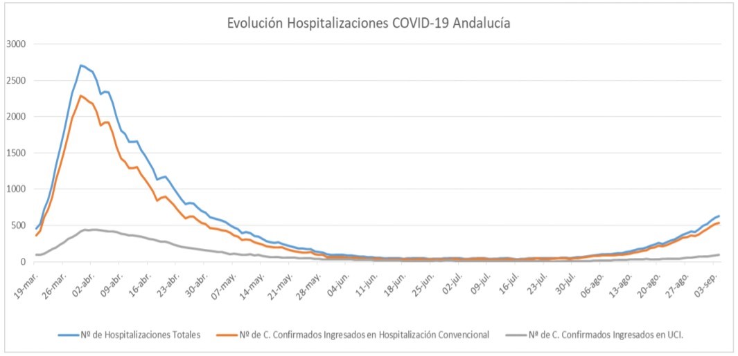 Por provincias: en Almería (98 hospitalizaciones, de los que 18 en UCI), Cádiz (88 hospitalizaciones, de los que 17 en UCI), Córdoba (81 hospitalizaciones, de los que 10 en UCI), Granada (64 hospitalizaciones, de los que 11 en UCI), Huelva (3 hospitalizaciones y ninguno en UCI), Jaén (27 hospitalizaciones, de los que 5 en UCI), Málaga (171 hospitalizaciones, de los que 25 en UCI) y Sevilla (100 hospitalizaciones, de los que 11 en UCI).