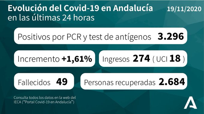 Por provincias: en Almería (124 hospitalizaciones, de los que 37 en UCI), Cádiz (380 hospitalizaciones, de los que 58 en UCI), Córdoba (310 hospitalizaciones, de los que 49 en UCI), Granada (736 hospitalizaciones, de los que 135 en UCI), Huelva (148 hospitalizaciones, de los que 16 en UCI), Jaén (331 hospitalizaciones, de los que 50 en UCI), Málaga (392 hospitalizaciones, de los que 52 en UCI) y Sevilla (741 hospitalizaciones, de los que 128 en UCI).