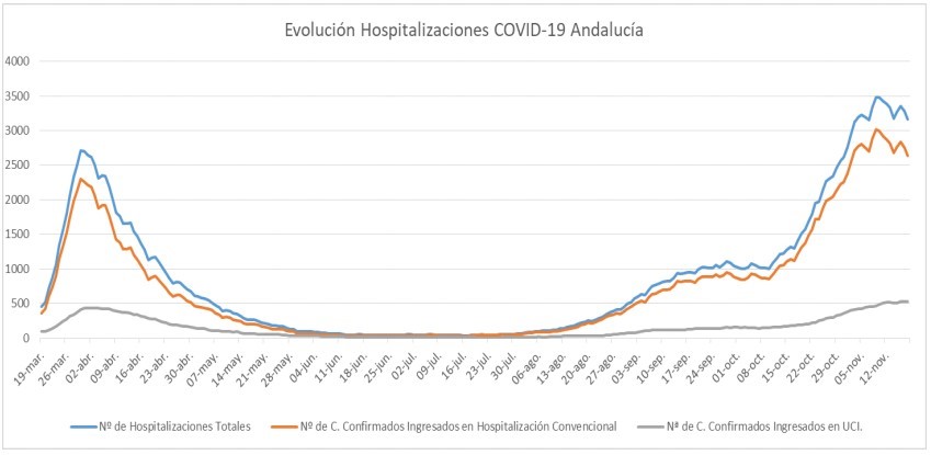 La Consejería de Salud y Familias informa de que, actualmente, 3.162 pacientes confirmados con COVID-19 permanecen ingresados en los hospitales andaluces, de los que 525 se encuentran en UCI.