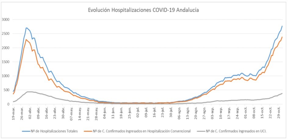 Por provincias: en Almería (96 hospitalizaciones, de los que 16 en UCI), Cádiz (253 hospitalizaciones, de los que 40 en UCI), Córdoba (277 hospitalizaciones, de los que 31 en UCI), Granada (692 hospitalizaciones, de los que 101 en UCI), Huelva (119 hospitalizaciones, de los que 12 en UCI), Jaén (296 hospitalizaciones, de los que 43 en UCI), Málaga (259 hospitalizaciones, de los que 40 en UCI) y Sevilla (772 hospitalizaciones, de los que 98 en UCI).