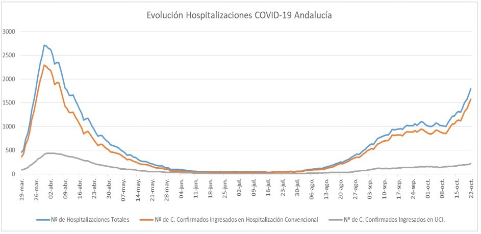 Por provincias: en Almería (55 hospitalizaciones, de los que 12 en UCI), Cádiz (181 hospitalizaciones, de los que 21 en UCI), Córdoba (168 hospitalizaciones, de los que 16 en UCI), Granada (397 hospitalizaciones, de los que 53 en UCI), Huelva (55 hospitalizaciones, de los que 6 en UCI), Jaén  (175 hospitalizaciones, de los que 20 en UCI), Málaga (218 hospitalizaciones, de los que 29 en UCI) y Sevilla (545 hospitalizaciones, de los que 62 en UCI).