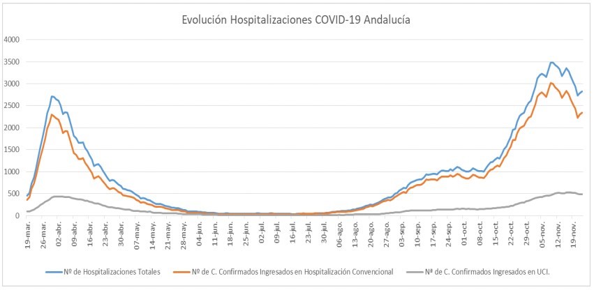 La Consejería de Salud y Familias informa de que, actualmente, 2.827 pacientes confirmados con COVID-19 permanecen ingresados en los hospitales andaluces, de los que 488 se encuentran en UCI.