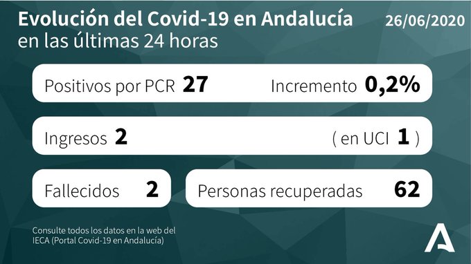 Por provincias: en Almería (2 hospitalizaciones y ninguno en UCI), Cádiz   (7 hospitalizaciones de los que 1 en UCI), Córdoba (3 hospitalizaciones y ninguno en UCI), Granada (10 hospitalizaciones de los que 5 en UCI), Huelva (3 hospitalizaciones de los que 2 en UCI), Jaén (1 hospitalizaciones de los que 1 en UCI), Málaga (11 hospitalizaciones de los que 1 en UCI) y Sevilla (5 hospitalizaciones de los que 1 en UCI).