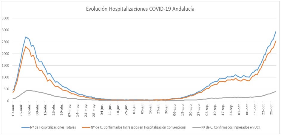 La Consejería de Salud y Familias informa de que, actualmente, 2.936 pacientes confirmados con COVID-19 permanecen ingresados en los hospitales andaluces, de los que 400 se encuentran en UCI.