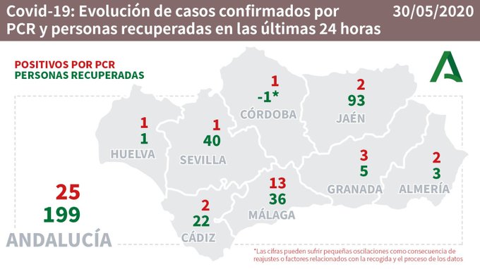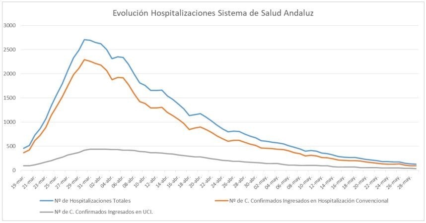 Por provincias: en Almería (11 hospitalizaciones y ninguno en UCI), Cádiz (23 hospitalizaciones de los que 6 en UCI), Córdoba (17 hospitalizaciones de los que 8 en UCI), Granada (27 hospitalizaciones de los que 7 en UCI), Huelva (4 hospitalizaciones de los que 1 en UCI), Jaén (7 hospitalizaciones de los que 2 en UCI), Málaga (22 hospitalizaciones de los que 3 en UCI) y Sevilla (18 hospitalizaciones de los que 6 en UCI).