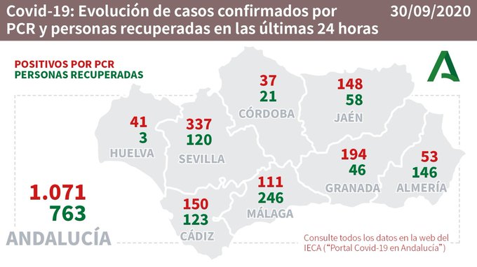 Por provincias: en Almería (42 hospitalizaciones, de los que 11 en UCI), Cádiz (127 hospitalizaciones, de los que 27 en UCI), Córdoba (146 hospitalizaciones, de los que 17 en UCI), Granada (105 hospitalizaciones, de los que 10 en UCI), Huelva (18 hospitalizaciones, de los que ninguno en UCI), Jaén   (86 hospitalizaciones, de los que 11 en UCI), Málaga (204 hospitalizaciones, de los que 29 en UCI) y Sevilla (356 hospitalizaciones, de los que 46 en UCI).