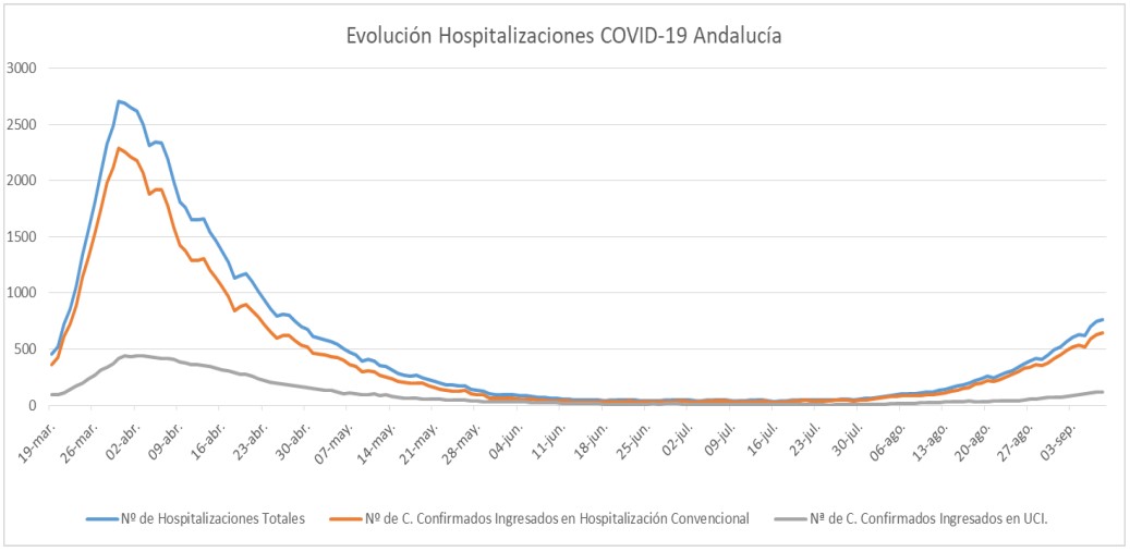 La Consejería de Salud y Familias informa de que, actualmente, 765 pacientes confirmados con COVID-19 permanecen ingresados en los hospitales andaluces, de los que 118 se encuentran en UCI.