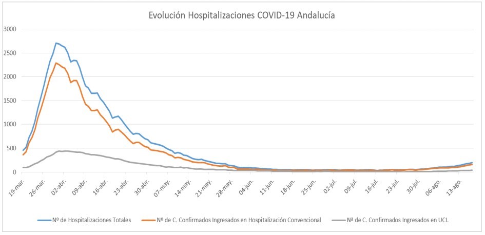 Por provincias: en Almería (62 hospitalizaciones, de los que 17 en UCI), Cádiz (22 hospitalizaciones, de los que 4 en UCI), Córdoba (13 hospitalizaciones, de los que 2 en UCI), Granada (22 hospitalizaciones, de los que 4 en UCI), Huelva (5 hospitalizaciones, de los que 1 en UCI), Jaén (9 hospitalizaciones y 1 en UCI), Málaga (44 hospitalizaciones, de los que 3 en UCI) y Sevilla (19 hospitalizaciones y 5 en UCI).