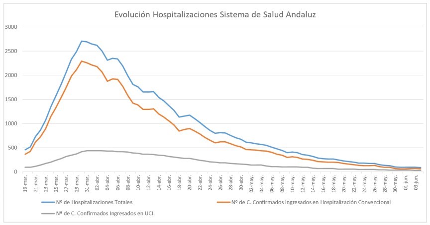 Por provincias: en Almería (12 hospitalizaciones y ninguno en UCI), Cádiz  (8 hospitalizaciones de los que 5 en UCI), Córdoba (15 hospitalizaciones de los que 6 en UCI), Granada   (17 hospitalizaciones de los que 6 en UCI), Huelva (3 hospitalizaciones de los que 1 en UCI), Jaén (2 hospitalizaciones de los que 1 en UCI), Málaga (17 hospitalizaciones de los que 4 en UCI) y Sevilla (13 hospitalizaciones de los que 5 en UCI).