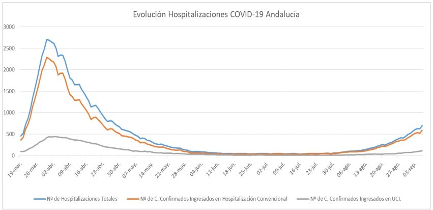 Por provincias: en Almería (84 hospitalizaciones, de los que 18 en UCI), Cádiz (94 hospitalizaciones, de los que 17 en UCI), Córdoba (85 hospitalizaciones, de los que 11 en UCI), Granada (77 hospitalizaciones, de los que 14 en UCI), Huelva (3 hospitalizaciones, de los que 1 en UCI), Jaén  (27 hospitalizaciones, de los que 6 en UCI), Málaga (212 hospitalizaciones, de los que 30 en UCI) y Sevilla (116 hospitalizaciones, de los que 13 en UCI).